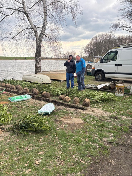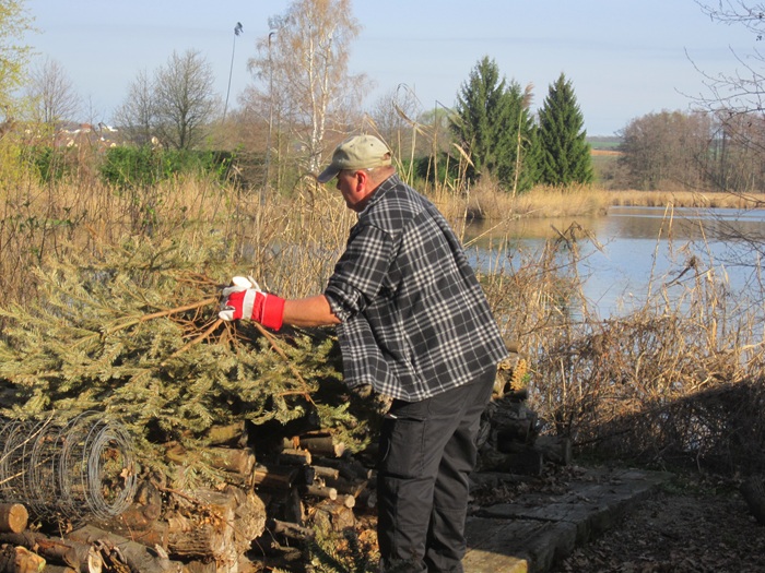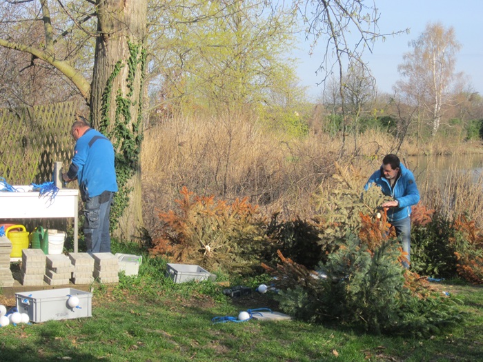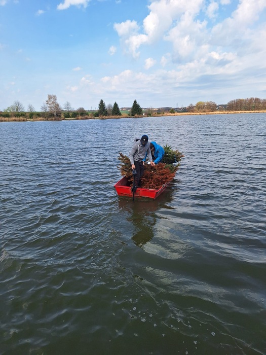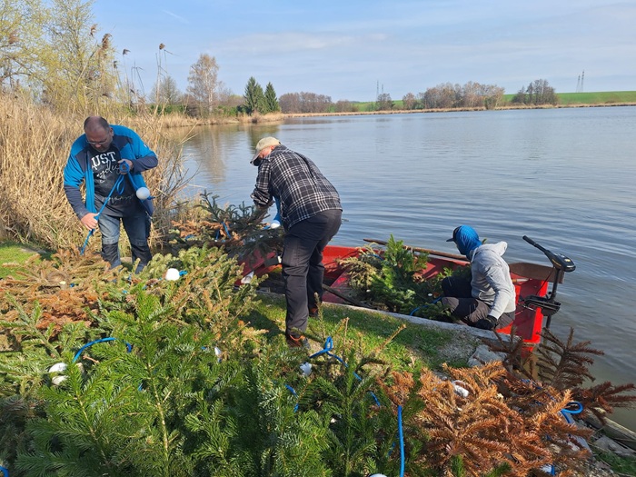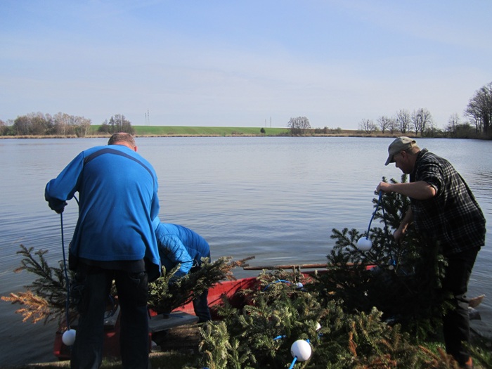 Der größte Teil der Arbeit betraf jedoch den erstmaligen Einsatz von Laichnestern für Zander. Diese wurden von Flo Maier und seinem Vater vorbereitet. Beim Teich wurden sodann Zweige von Nadelbäumen daran befestigt und die einzelnen Nester mit Bojen gesichert. Die Nester wurden dann von Flo Maier und Martin Fidler im Teich verteilt, wobei Stellen ausgewählt wurden, die die Fischerei sowenig wie möglich beeinträchtigten. Nester wurden somit im Schongebiet, direkt neben den Booten, neben dem Zapfen und entlang des Damms ausgebracht. Beobachtungen mit dem Echlot haben während der Laichzeit gezeigt, dass die Nester durchaus von den Zandern angenommen wurden. Es konnten einige schöne Zander beobachtet werden. In einigen Jahren wird man hoffentlich den Erfolg der Bemühungen sehen. Ein großer Dank an alle die hier so tatkräfitg mitgeholfen haben.