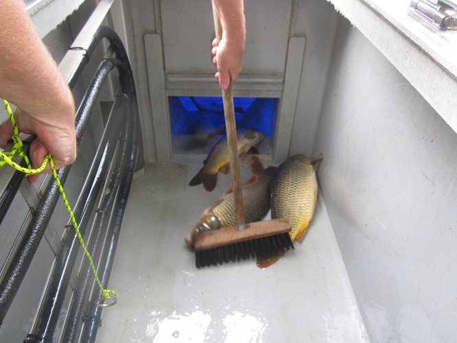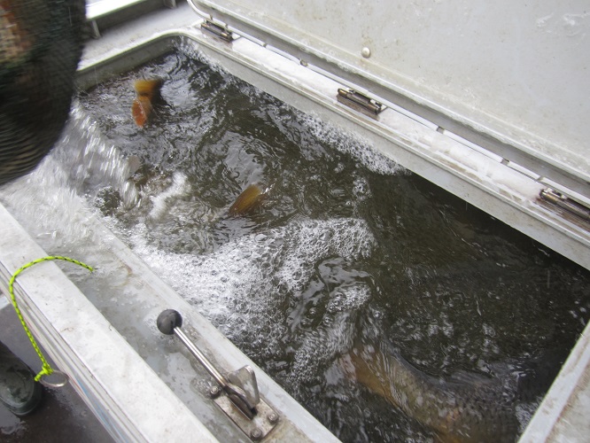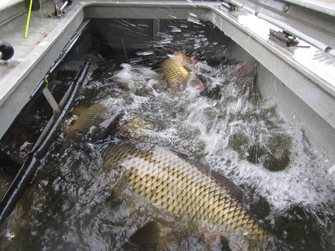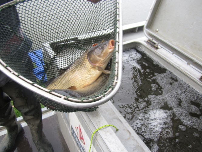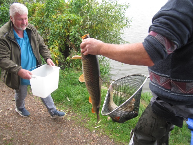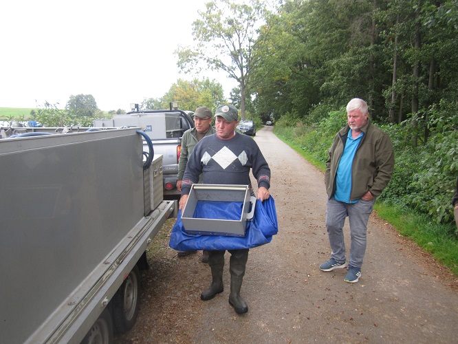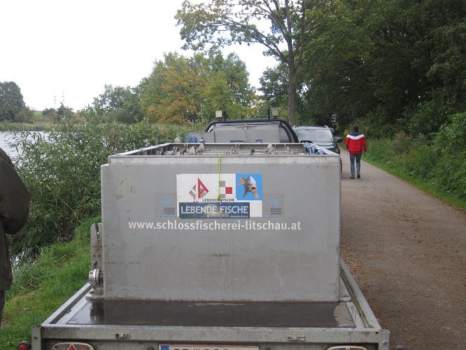 Am 02.10. wurden 1.113 kg Karpfen besetzt, am 14.10. 557 kg Karpfen und 238 kg Zander und am 22.10. 695 kg Karpfen und 386 kg Amur.