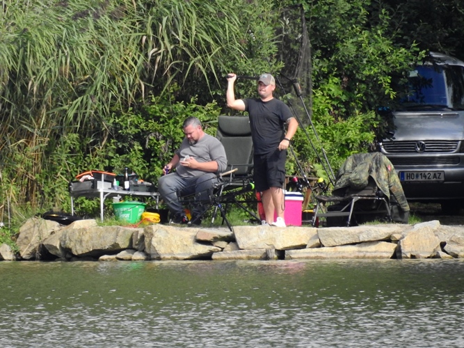 Die Siegerehrung wurde von unserem Obmann Dieter Antony, Gerhard Zeder, Herbert Wachter und Ignaz Hrdlicka durchgeführt. Unsere Sachpreise für den vierten Platz brachten wir heuer gar nicht an den Mann. Der dritte Platz ging mit einem tollen Karpfen mit 4 kg an die Kollegen Reinbacher/Amon auf Platz D2, den zweiten Platz mit ebenfalls einem Fisch von 4,93 kg holten sich Günter und Brigitte Schmidt auf Platz 2 und den Sieg konnten mit immerhin 3 Karpfen uns insgesamt 12,80 kg die Kollegen Schweitzer/Graf auf Platz 18 erreichen.