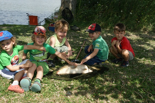 Nikos, Eneas, Jakob, Valentin und Samuel bestaunen den Karpfen.