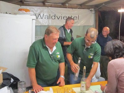 Franz schaut interessiert auf die Schnapsflasche.