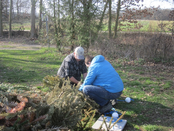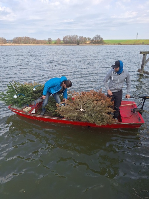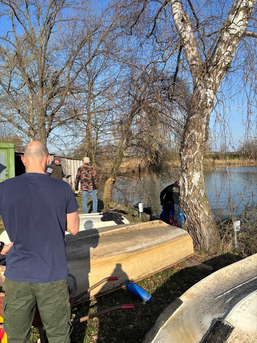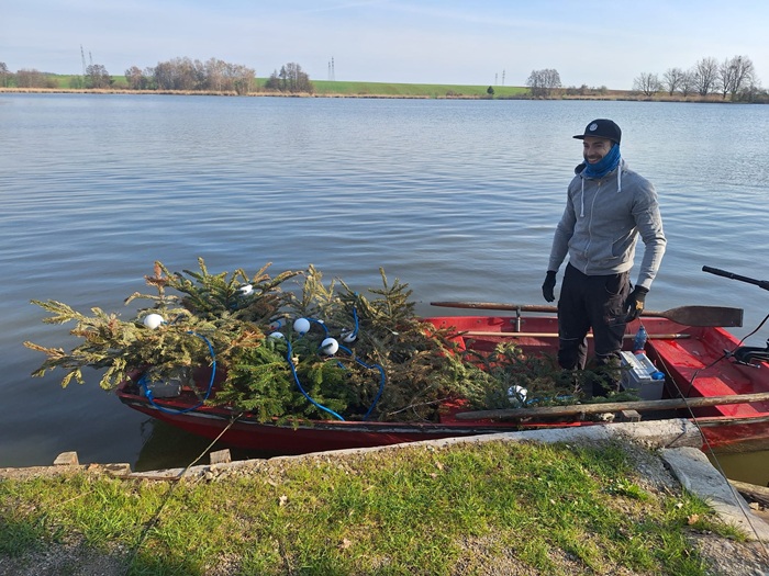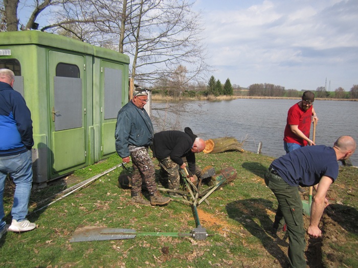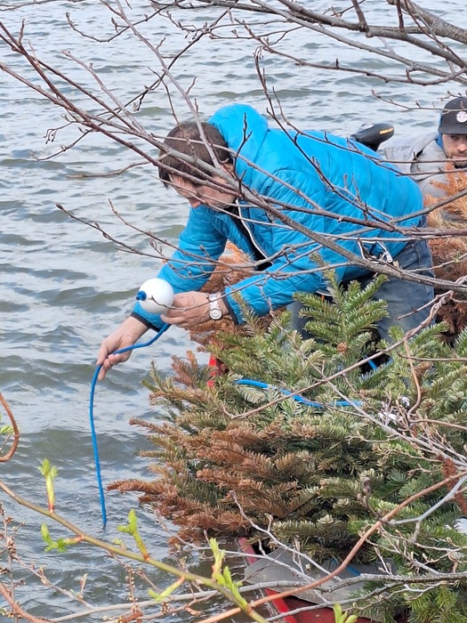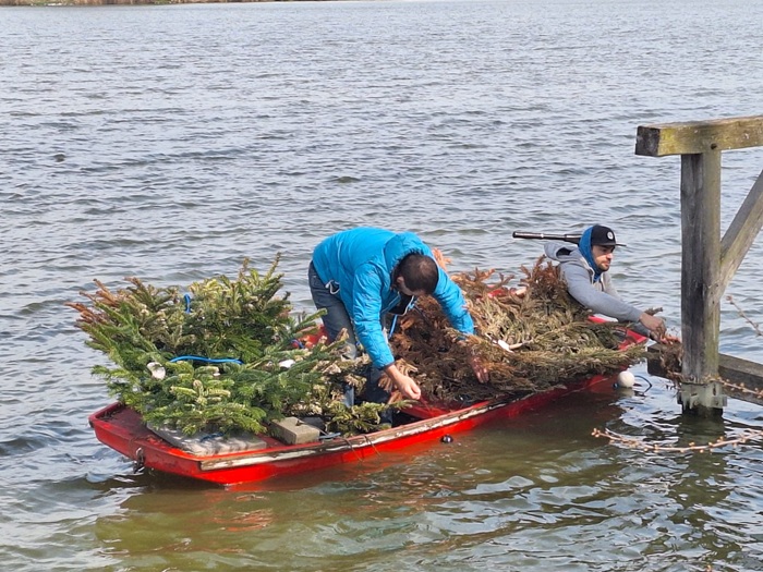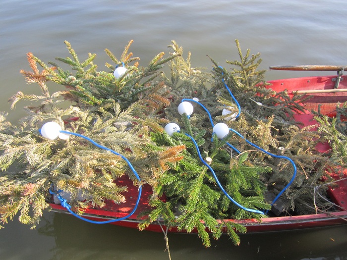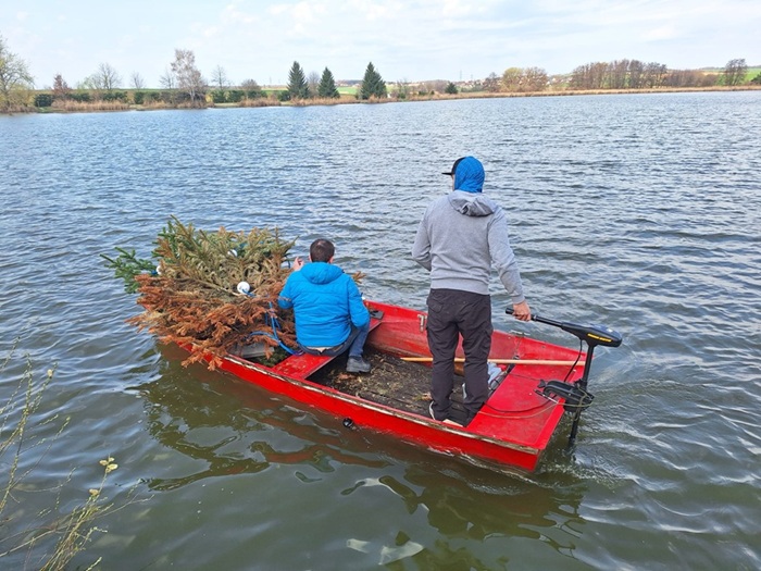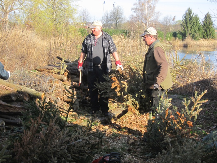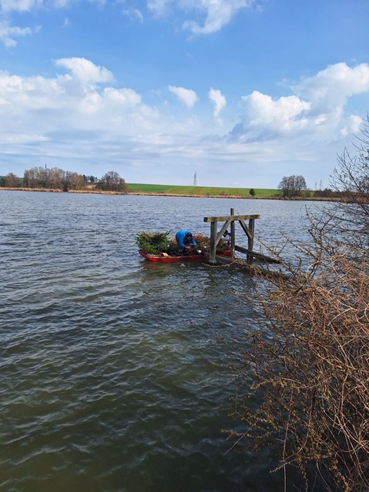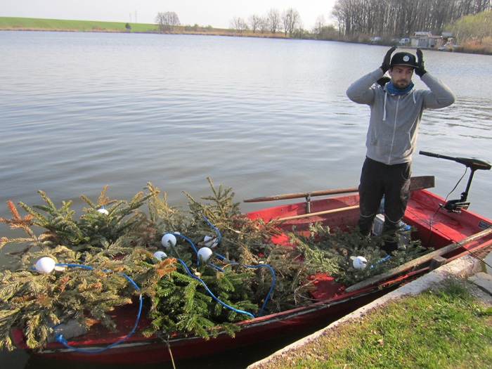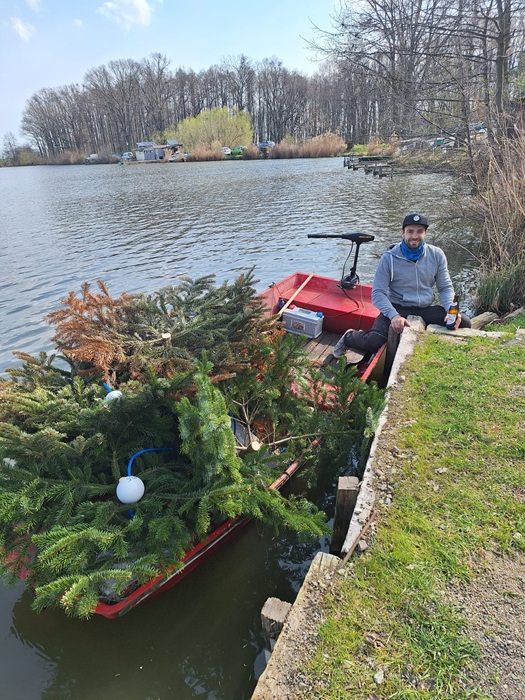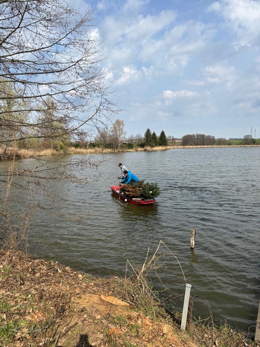 Der größte Teil der Arbeit betraf jedoch den erstmaligen Einsatz von Laichnestern für Zander. Diese wurden von Flo Maier und seinem Vater vorbereitet. Beim Teich wurden sodann Zweige von Nadelbäumen daran befestigt und die einzelnen Nester mit Bojen gesichert. Die Nester wurden dann von Flo Maier und Martin Fidler im Teich verteilt, wobei Stellen ausgewählt wurden, die die Fischerei sowenig wie möglich beeinträchtigten. Nester wurden somit im Schongebiet, direkt neben den Booten, neben dem Zapfen und entlang des Damms ausgebracht. Beobachtungen mit dem Echlot haben während der Laichzeit gezeigt, dass die Nester durchaus von den Zandern angenommen wurden. Es konnten einige schöne Zander beobachtet werden. In einigen Jahren wird man hoffentlich den Erfolg der Bemühungen sehen. Ein großer Dank an alle die hier so tatkräfitg mitgeholfen haben.